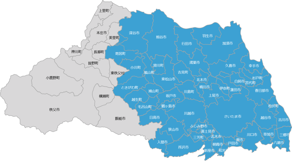 上尾市・朝霞市・伊奈町・入間市・小川町・桶川市・越生町・春日部市・加須市・川口市・川越市・川島町・北本市・行田市・久喜市・熊谷市・鴻巣市・越谷市・さいたま市・坂戸市・幸手市・狭山市・志木市・白岡市・杉戸町・草加市・鶴ヶ島市・ときがわ町・所沢市・戸田市・滑川町・新座市・蓮田市・鳩山町・羽生市・東松山市・日高市・深谷市・富士見市・ふじみ野市・松伏町・三郷市・宮代町・三芳町・毛呂山町・八潮市・吉川市・吉見町・寄居町・嵐山町・和光市・蕨市