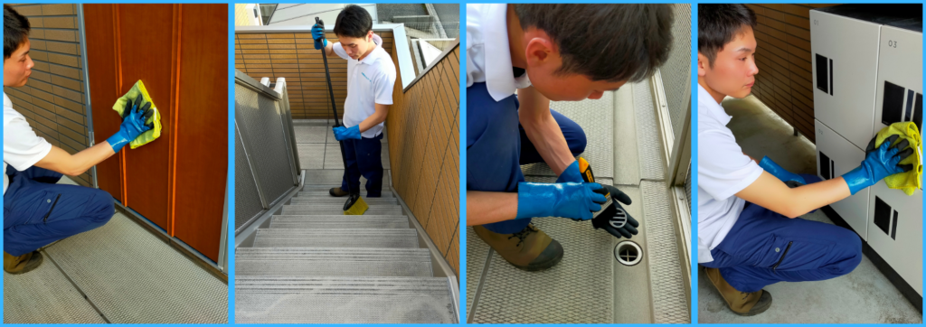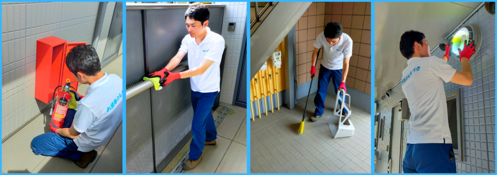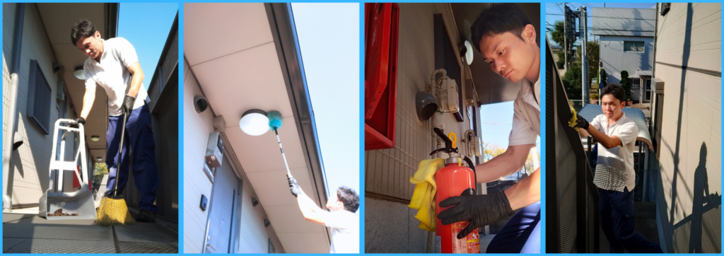 モップ掛けや除草、ゴミ置き場のブラシ洗浄、管球交換なども行っております。