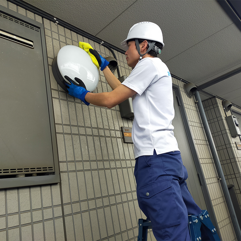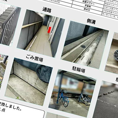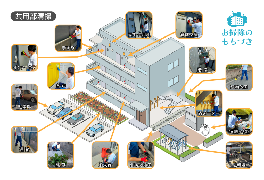 エントランス・階段・点灯確認・管球交換・通路・側溝・手すり・除草・除草剤散布・ドア・インターホン・窓格子・ゴミ置き場・ゴミ分別・建物外周・駐車場・駐輪場・共用灯・消化器
